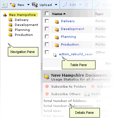 El Explorador de Proyectos, la Papelera de Reciclaje de Proyecto y los separadores Tareas, Documentos, Discusiones, Wiki y Blog de la vista de la aplicación de Oracle WebCenter Collaboration se dividen en tres paneles: El panel de navegación a la izquierda, el panel de tabla a la derecha y el panel de detalles en la parte inferior derecha. El panel de tabla contiene objetos que pertenecen al nodo seleccionado en el panel de navegación.